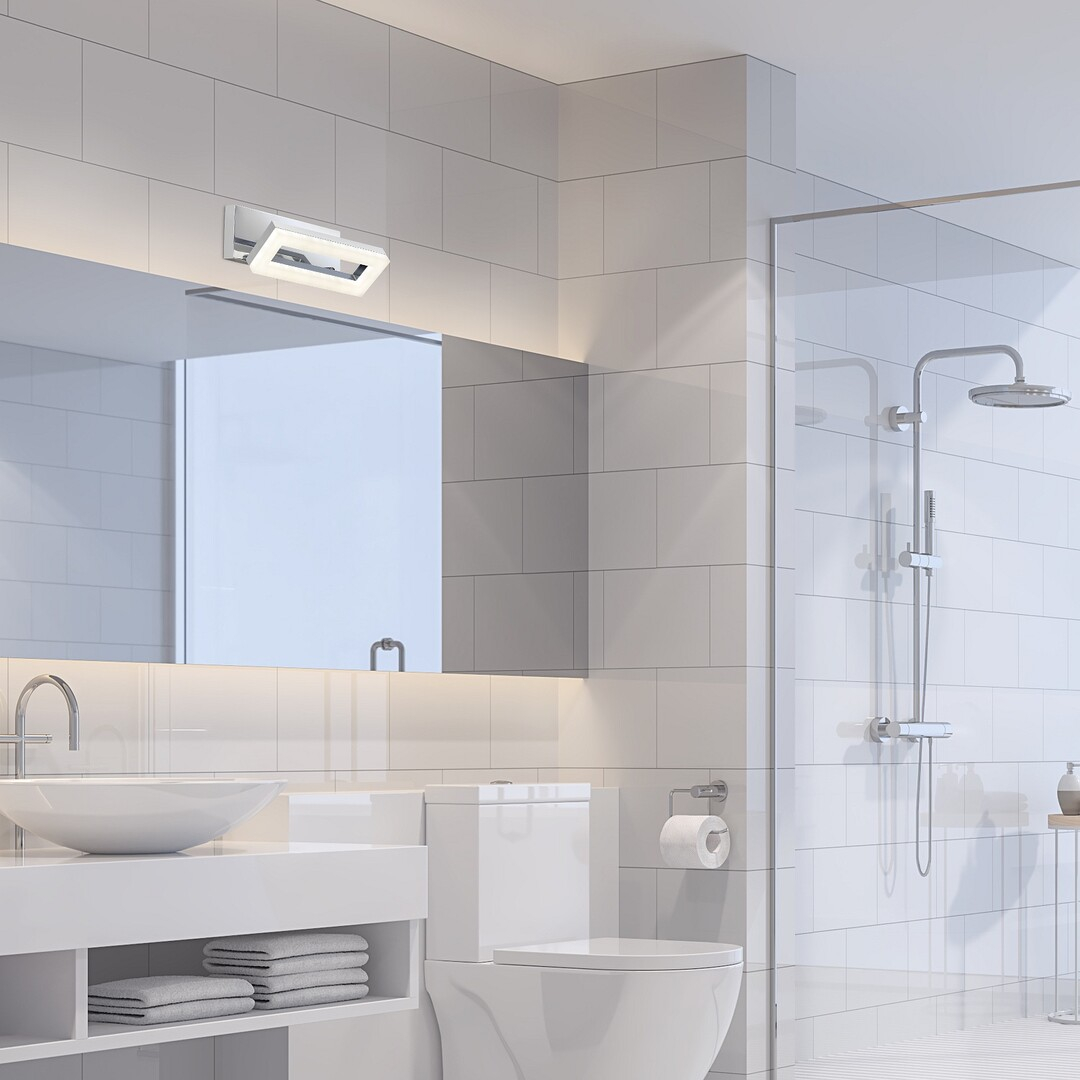 Lampa de perete pentru baie Blas este un design propriu Rábalux, care creează un efect curat și modern în baie cu lumina sa albă naturală. Lampa din metal cromat este alcătuită dintr-un cap de lampă dreptunghiular, decupat în mijloc și un abajur din plastic alb, putând fi montat pe perete cu ajutorul unei baze decorative unghiulare cromate de dimensiuni identice cu capul de lampă. Capul lămpii poate fi înclinat în sus și în jos, astfel puteți controla lumina lui Blas în funcție de necesități. Lampa de iluminare a oglinzii are o sursă de lumină LED încorporată aparținând clasei energetice F, cu o putere de 15 W, o luminozitate de 1570 de lumeni cu abajur, 1880 de lumeni fără abajur. Sursa de lumină cu o temperatură de culoare de 4000 K are o durată de viață de 30 000 de ore. Protecția IP44 a lămpii garantează că Blas este protejat împotriva pătrunderii obiectelor solide mai mari de 1 mm, precum și împotriva stropirii cu apă din orice direcție. Dimensiunile lămpii de baie sunt următoarele: lățime 270 mm, înălțime 90 mm, distanța față de perete 160 mm.