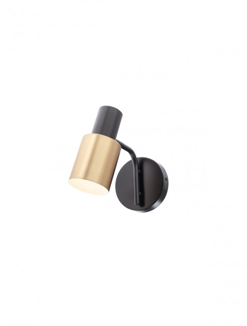 Aplic? orientabil? pentru interior, structur? din metal vopsit în câmp electrostatic negru mat, abajur metalic finisat alam? antic? la exterior ?i alb mat la interior.