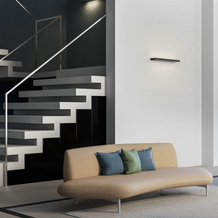 Aplică moderna pentru interior, cu dispersie directă/indirectă a luminii, cu structura din aluminiu vopsit în câmp electrostatic culoare negru mat si dispersoare din acril satinat.
