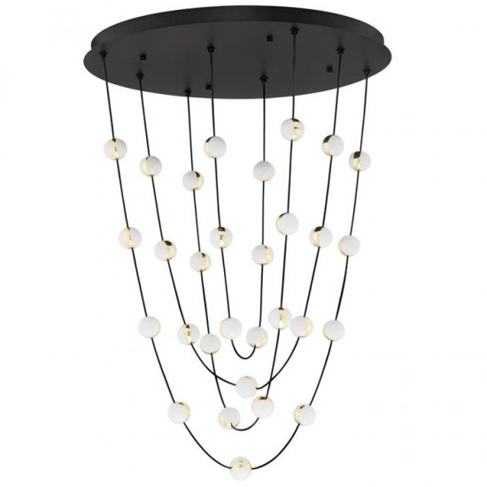 Candelabru pentru interior, dimabil, cu structura din metal vopsit negru mat cu elemente finisate auriu si dispersoare din acril alb opal. Echipata cu LED-uri SMD 102W cu temperatura de culoare alb cald 3000K. Total flux luminos 8914 lumeni.