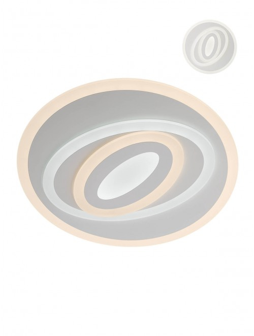 Plafonier? pentru interior echipat? cu LED-uri SMD, structur? din metal vopsit alb mat cu dispersoare din acril satinat. Livrat? cu telecomand? (cu 2 baterii AAA incluse) cu urm?toarele func?ii: ON/OFF, 3 programe de func?ionare, reglarea intensit??ii lum