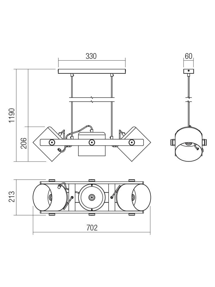 Suspensie pentru interior, structură din metal vopsit negru mat și lemn de fag natur, dispersoare orientabile din metal vopsit negru mat la exterior și alb la interior.