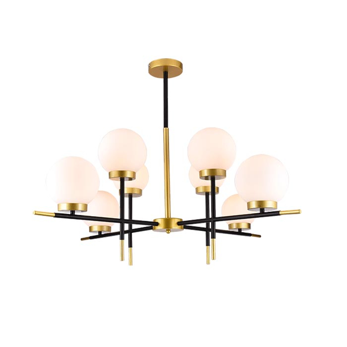 Lustra moderna pentru interior, cu structura din metal finisat aur mat cu detalii negru mat si abajururi din sticla opal. Sursele de iluminat nu sunt incluse. Stil Stil modern Numar surse Numar surse 8 Tip sursa Tip sursa E27 Inaltime reglabila Inaltime reglabila nu Dimensiuni diametru 94 cm distanta de la perete/tavan 60 cm