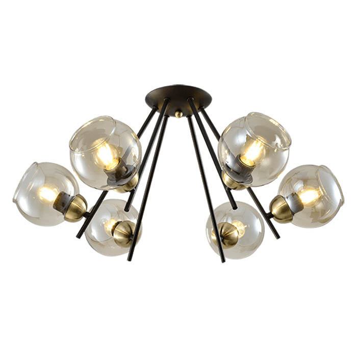 Lustra moderna pentru interior, cu structura din metal vopsit negru mat cu elemente finisate bronz si abajururi din sticla ambra. Sursele de iluminat nu sunt incluse. Stil Stil modern Numar surse Numar surse 6 Tip sursa Tip sursa E27 Inaltime reglabila Inaltime reglabila nu Dimensiuni diametru 67 cm distanta de la perete/tavan 30 cm