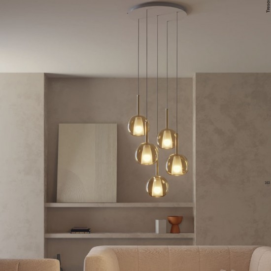 Suspensie moderna pentru interior, cu structură din metal cromat si dispersor din sticlă borosilicată suflată, ambra transparent în exterior și satinat la interior.