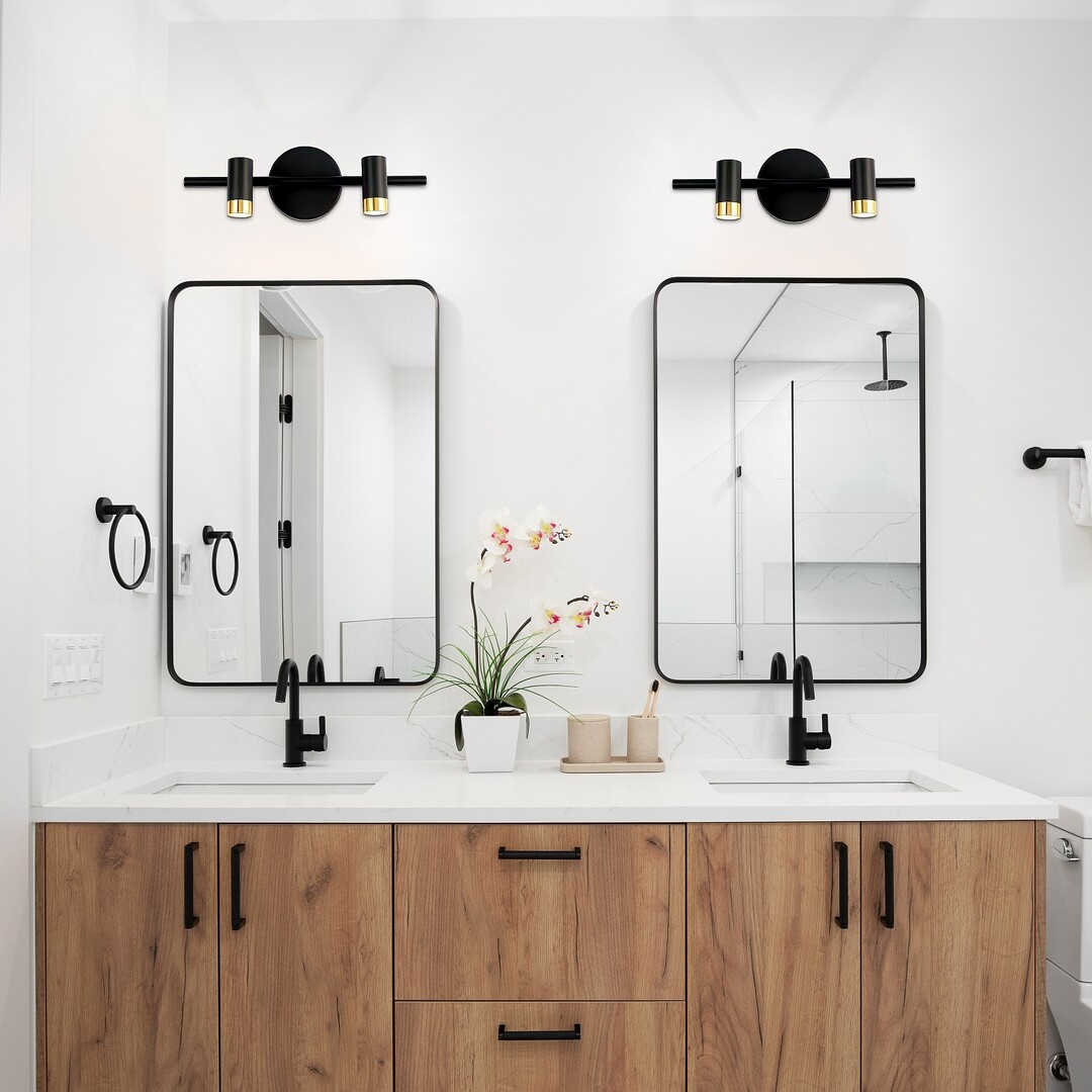 Lampa de perete cu 2 becuri Rabalux Kadir este recomandată celor care caută un model care combină un design simplu cu eleganța. Această lampă LED este concepută în spiritul stilului industrial, în culori negru și auriu, cu un corp cilindric și abajururi din plastic transparent. Baza decorativă are o formă rotundă, de culoare neagră, cu o bară orizontală atașată. Aceasta susține cele două capete de lampă orientate în jos, situate la dreapta și la stânga bazei decorative. Lampa de perete este echipată cu un comutator și are o sursă de lumină LED încorporată care emite o lumină albă naturală. Deoarece acest model este protejat împotriva pătrunderii particulelor solide cu un diametru de 1 mm sau mai mare și împotriva stropilor de apă din orice direcție, îl recomandăm nu doar pentru living, ci și pentru baie, fără probleme. Datorită tehnologiei LED, se caracterizează printr-o funcționare eficientă din punct de vedere energetic și o durată lungă de viață.