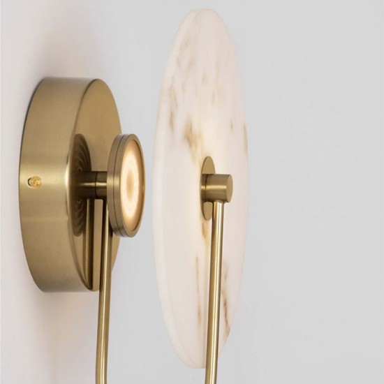 Aplica moderna pentru interior, cu structură din metal și aluminiu finisata alama si dispersor din metacrilat aspect marmura. Echipată cu LED-uri SMD 6W cu temperatura de culoare alb cald 3000K. Total flux luminos 417 lumeni.
