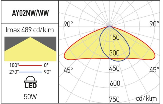 Sistem optic cu lentilă din policarbonat tratat anti-UV, cu distribuție luminoasă 70°x140°, pentru străzi principale sau secundare.