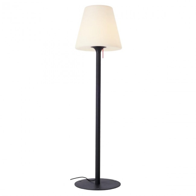 Lampadar pentru exterior, structură din metal vopsit în câmp electrostatic gri închis și dispersor din polietilenă albă rezistentă la raze UV. Echipat cu fișă și cablu de alimentare (lungime 3 metri) prevăzut cu intrerupător.