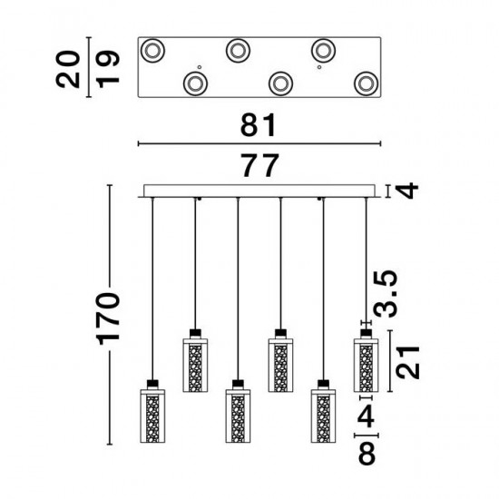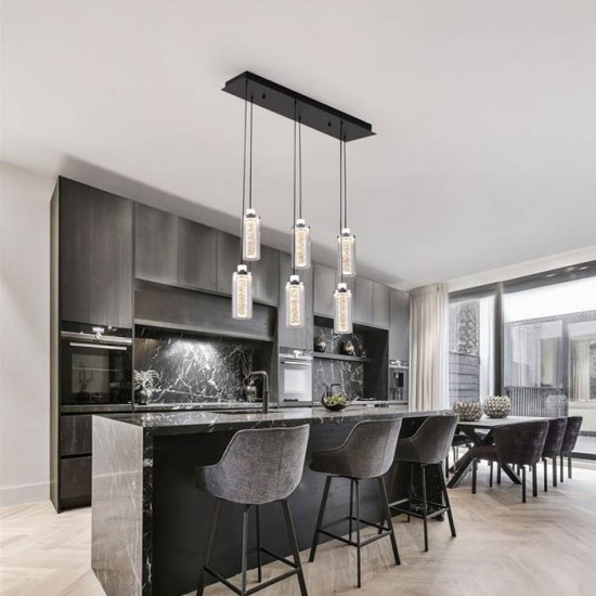 Lustra moderna pentru interior, cu structura din aluminiu si metal vopsit negru mat cu elemente cromate si abajururi duble din acril masiv transparent la interior si sticla transparenta la exterior.
