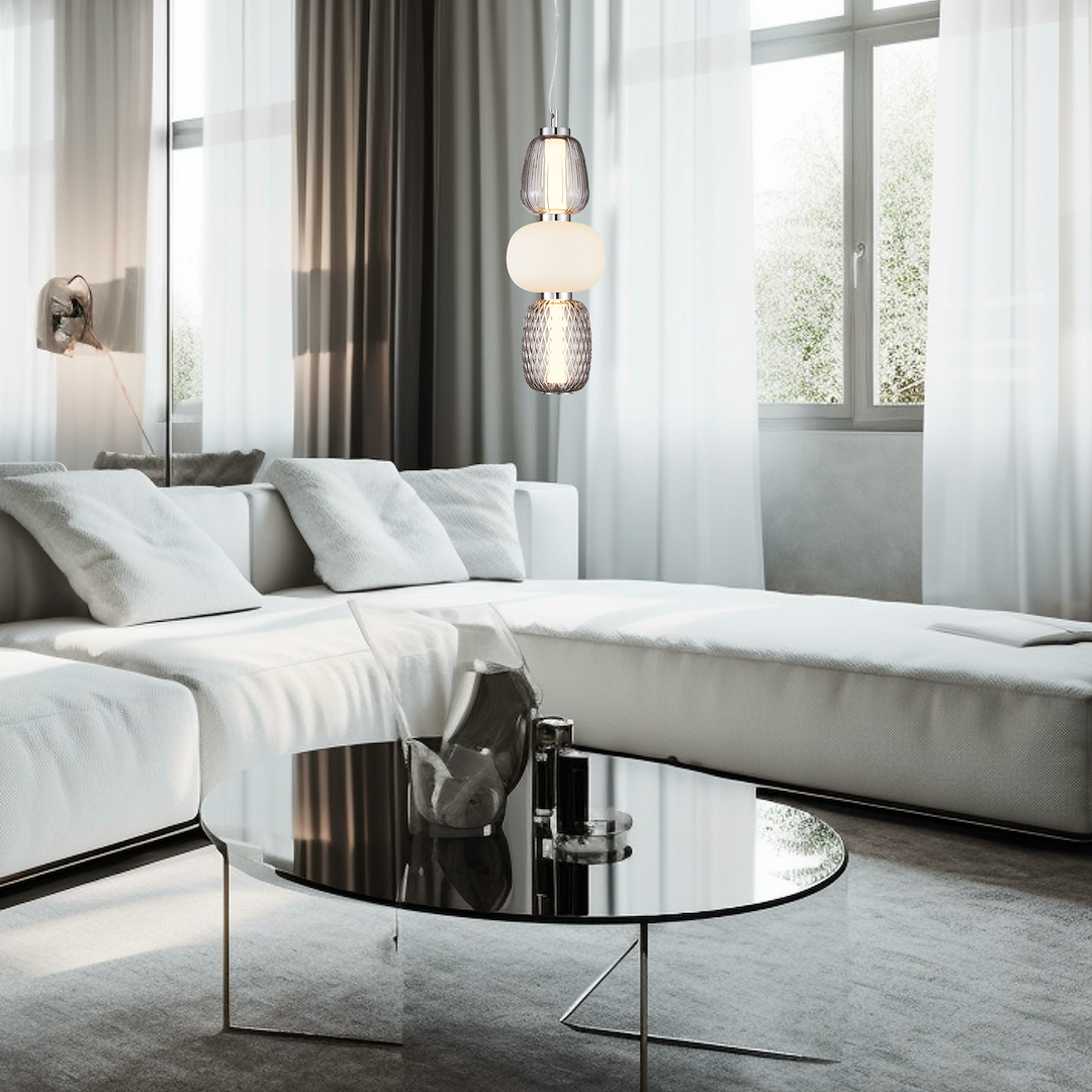 Pendul Caro combina functionalitatea cu designul contemporan. Realizata din Crom Metal & Sticlă. Este dotata cu sursa de lumina LED, putere de 28W LED, flux luminos de 3748lm, temperatura de culoare 3000K, asigurand o iluminare eficienta si placuta. Prezinta gradul de protectie IP20, fiind potrivita pentru utilizare interioara. Functioneaza la tensiune de 230V. Dimensiunile sale (diametru de 170mm, adancime de 170mm, inaltime reglabila 365-1785mm) o fac perfect adaptata pentru spatii generoase precum bucatarii, sali de mese, sufragerii. Unghiul de iluminare de 120° asigura o distributie corecta si uniforma a luminii in spatiu. O solutie de iluminat eleganta care va transforma atmosfera oricarui spatiu modern.