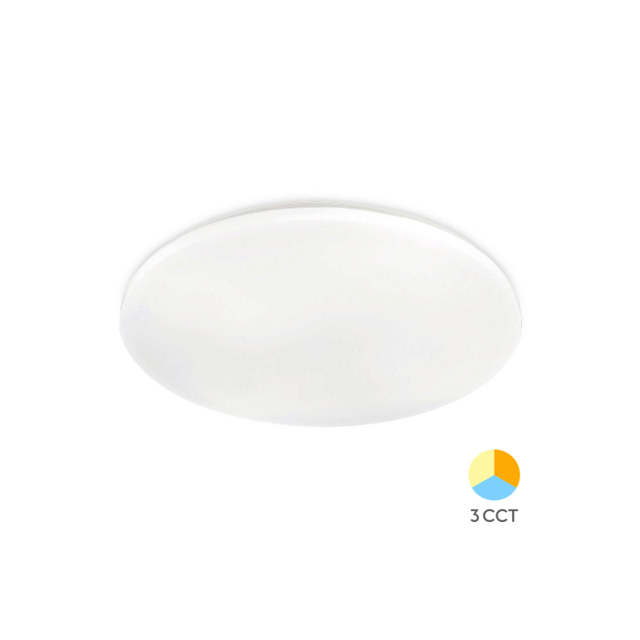 Plafonieră LED 34W cu flux luminos de 3550lm și funcție 3-în-1 pentru selectarea temperaturii de culoare (3000K / 4000K / 6500K). Diametru 325 mm, înălțime 60 mm. Design modern alb, iluminare uniformă 120°, IP20. Ideală pentru living, dormitor, bucătărie sau birou.