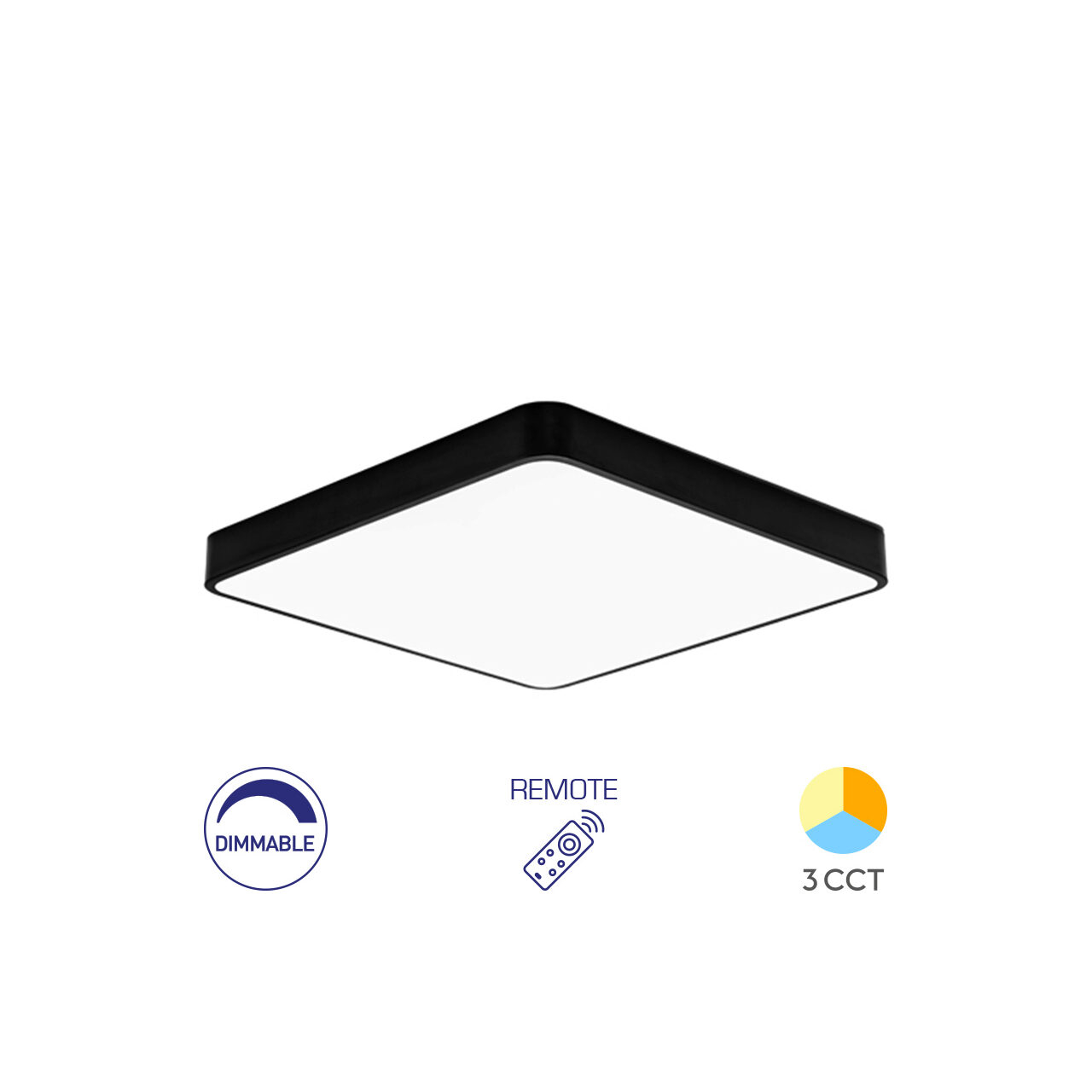 Plafonieră LED 45W cu flux luminos de 4650lm, funcție 3-în-1 pentru reglarea temperaturii de culoare (3000K / 4000K / 6500K) și telecomandă inclusă. Dimensiuni: 500x500 mm, înălțime 50 mm. Design modern negru, iluminare uniformă 120°, IP20. Ideală pentru living, dormitor sau birou.