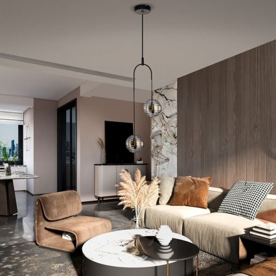 Suspensie moderna pentru interior, dimabila, cu structură din aluminiu și metal vopsit negru mat si dispersoare din sticla suflata fumurie..