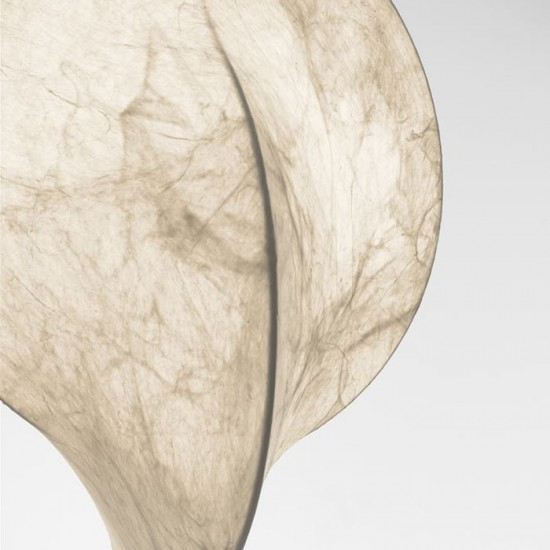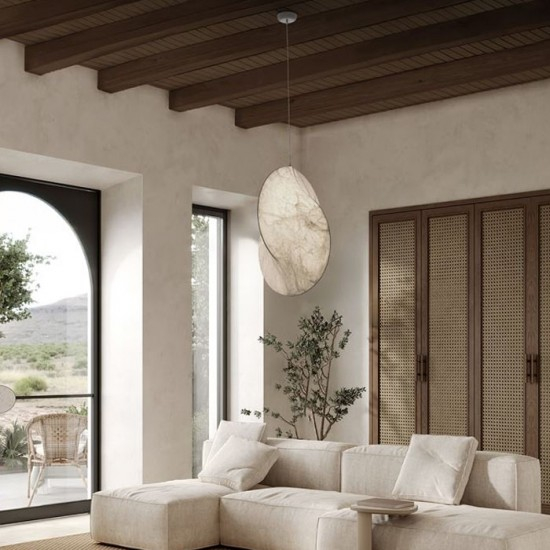 Suspensie moderna pentru interior, cu structura din metal vopsit alb si abajur din membrana de matase sintetica alba.