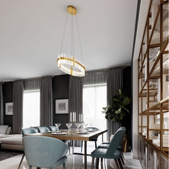Suspensie moderna pentru interior, dimabila, cu structura din metal finisat auriu si dispersor din baghete de cristal K9.
