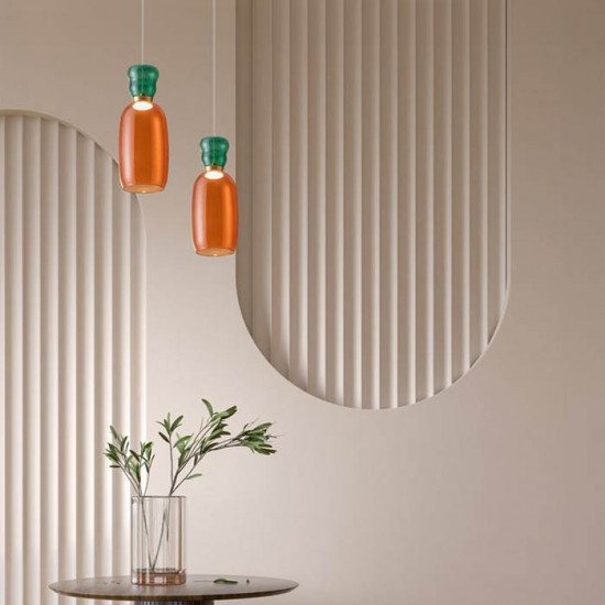 Pendul modern pentru interior, cu structura din metal finisat auriu si dispersor din sticla multicolora. Echipata cu LED-uri SMD 9W cu temperatura de culoare alb cald 3000K. Total flux luminos 914 lumeni.