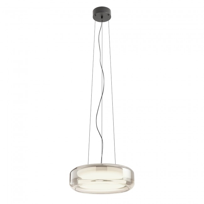 Suspensie pentru interior, echipată cu LED-uri SMD, cu posibilitate de selectare a temperaturii de culoare a luminii, structură din metal și aluminiu vopsită în câmp electrostatic în culoare negru mat, doua dispersoare din sticlă suflată, fumuriu degrade la exterior și alb opal la interior.