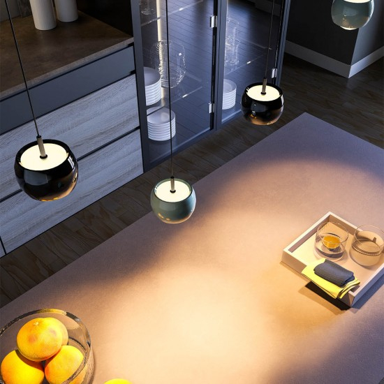 Suspensie moderna pentru interior, cu lumină directă/indirectă, cu structură din aluminiu finisata crom negru, lentilă din sticlă în partea de jos și dispersor din acril alb opal în partea de sus.