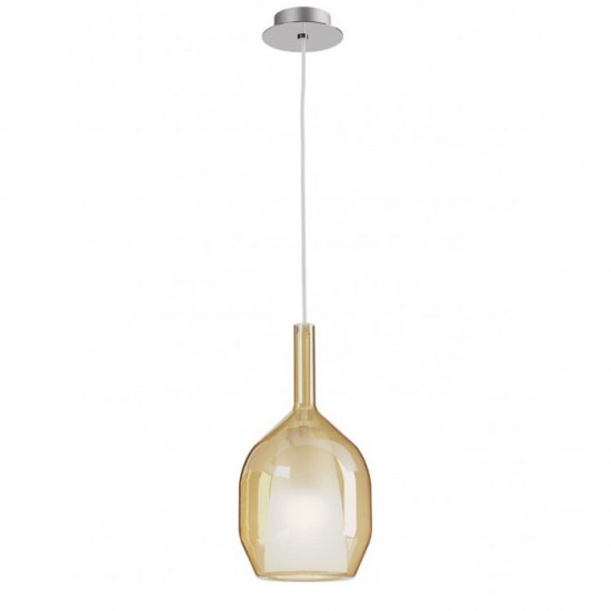 Suspensie moderna pentru interior, cu structură din metal cromat si dispersor din sticlă borosilicată suflată, ambra transparent în exterior și satinat la interior.