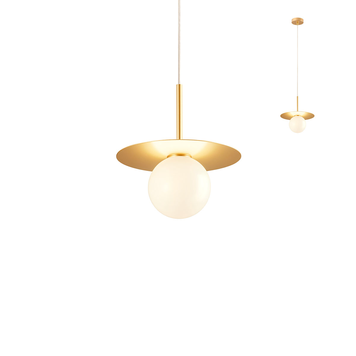 Suspensie pentru interior, structură din metal finisat auriu mat, dispersor din sticlă suflată opal.