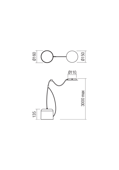 Suspensie pentru interior, structură și dispersor orientabil din metal vopsite negru mat, reflector din PMMA alb. Se livrează cu 3 metri de cablu textil negru și accesorii de fixare pentru tavan.