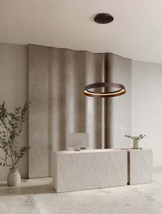 Parametri diametru (mm): 450 inaltime (mm): 1500 adancime (mm): 640 numar surse / tip baza: 1 x LED integrat putere maxima a sursei: 52 Tensiune: 230 V Sursa in set: LED 52 W, 3717 lm, 2700-4000 K culoare lampa: maro si nuante de maro material: aluminiu/acrilicIP: 20 Lampa suspendata ORMI de la Nova Luce. Reglabil prin sistemul TRIAC. Funcția DIP-Switch: schimbarea culorii luminii folosind comutatorul de pe corp.