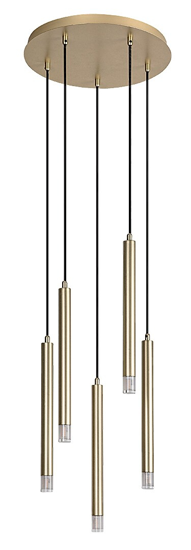 Lampa suspendată cu 5 becuri Rabalux Ramira este recomandată celor care caută o lampă suspendată minimalistă ce poate fi integrată în aproape orice încăpere din casa lor modernă. Lampa este realizată din metal auriu, cu abajururi transparente din acrilic și o bază decorativă mare, rotundă, de aceeași culoare cu capetele lămpii. Capetele lămpii au o formă tubulară, cilindrică și sunt suspendate la înălțimi diferite, ceea ce conferă lămpii suspendate un aspect interesant. Acest model este alegerea ideală pentru living, bucătărie, sufragerie sau dormitor. Poți să o instalezi deasupra mesei de dining sau chiar deasupra patului. Lampa suspendată poate fi utilizată cu cinci becuri, fiecare cu o putere de până la 5 W. Tipul de soclu este G9. Poți alege surse de lumină care emit lumină albă caldă sau naturală. Lampa suspendată este furnizată fără surse de lumină.