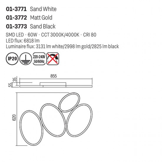 Echipată cu LED-uri SMD CCT 60W, cu posibilitate de selectare a temperaturii de culoare a luminii alb cald 3000K sau alb neutru 4000K.