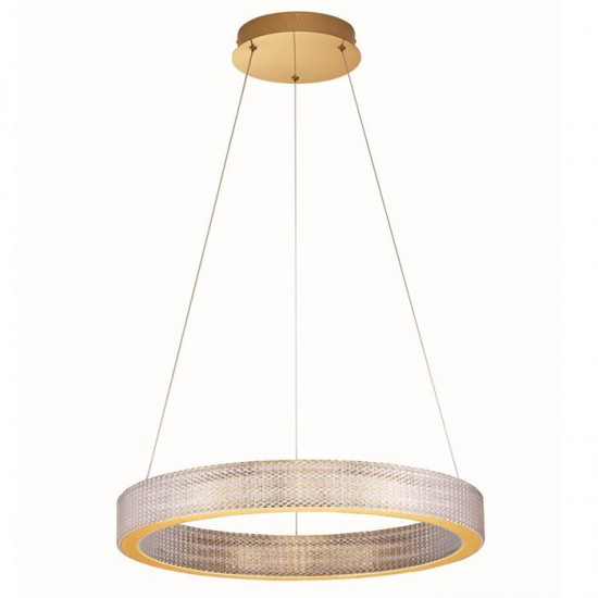 Suspensie moderna pentru interior, dimabila, cu structura din aluminiu si metal finisat auriu lucios si dispersor din acril transparent amprentat la cald.