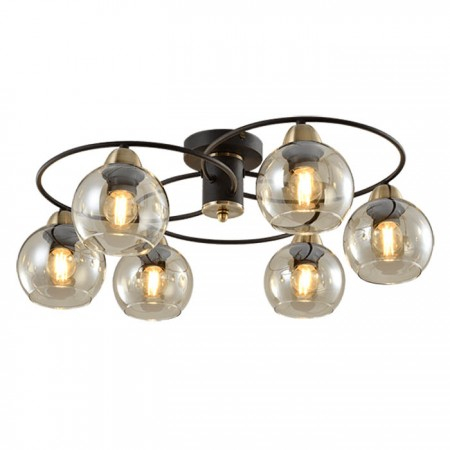 Lustra moderna pentru interior, cu structura din metal vopsit negru mat cu elemente fiinisate bronz si abajururi din sticla ambra Sursele de iluminat nu sunt incluse. Stil Stil modern Numar surse Numar surse 6 Tip sursa Tip sursa E27 Inaltime reglabila Inaltime reglabila nu Dimensiuni diametru 61 cm distanta de la perete/tavan 25 cm