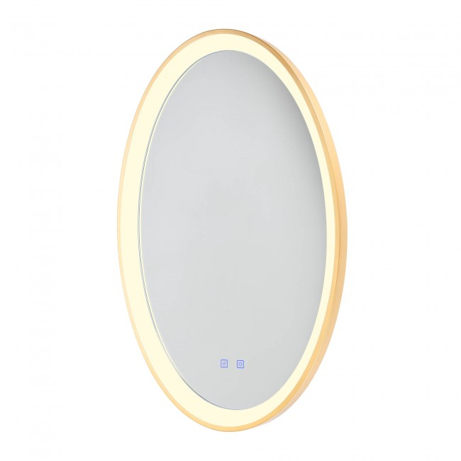 Oglindă cu lumină pentru interior, protejată la umiditate, echipată cu LED-uri SMD, întrerupător touch și dimmer, posibilitate de selectare a temperaturii de culoare a luminii de la alb cald la alb rece și funcție de dezaburire. Structură din aluminiu și metal vopsită auriu mat, dispersor din acril alb opal și oglindă.