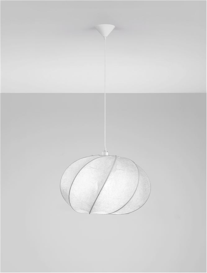 Material: Artificial Silk & Sandy White Metal Base Bulb Type: LED E27 · 1x12 Watt 100-240 Volt IP20 Product No: 9586617 Category: Suspension Dimensions: D: 55 H: 230 cm