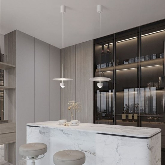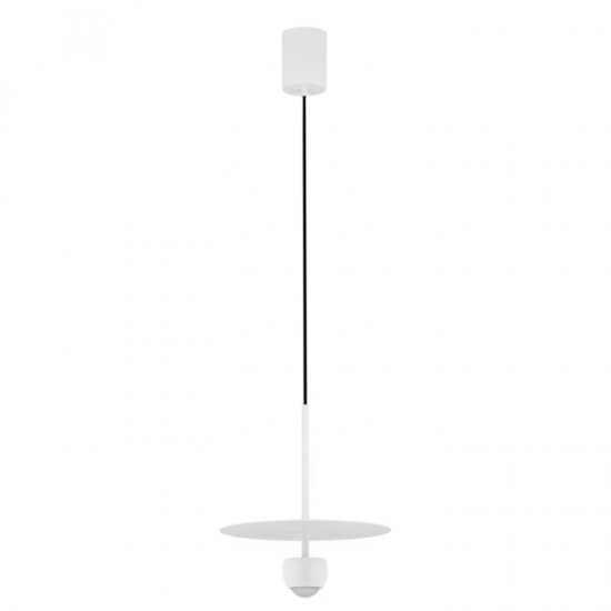 Suspensie moderna pentru interior, cu structura din metal vopsit in camp electrostatic alb mat si dispersor din acril alb opal. Echipata cu LED-uri SMD 8W cu temperatura de culoare alb cald 3000K. Total flux luminos 590 lumeni.