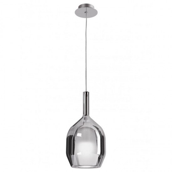 Suspensie moderna pentru interior, cu structură din metal cromat si dispersor din sticlă borosilicată suflată, fumuriu oglindat în exterior și satinat la interior.