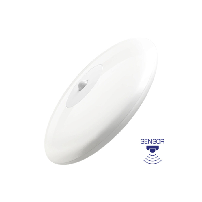 Plafonieră LED rotundă de 18 W cu senzor de mișcare integrat și iluminare alb cald la 3000 K, cu flux luminos de 1740 lm. Grad de protecție IP44 și protecție la impact IK05, potrivită pentru iluminare eficientă în holuri, coridoare, bucătării sau alte spații interioare sau semi-protejate. Diametru 260 mm, înălțime 65 mm și greutate 550 gr.