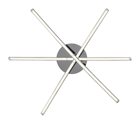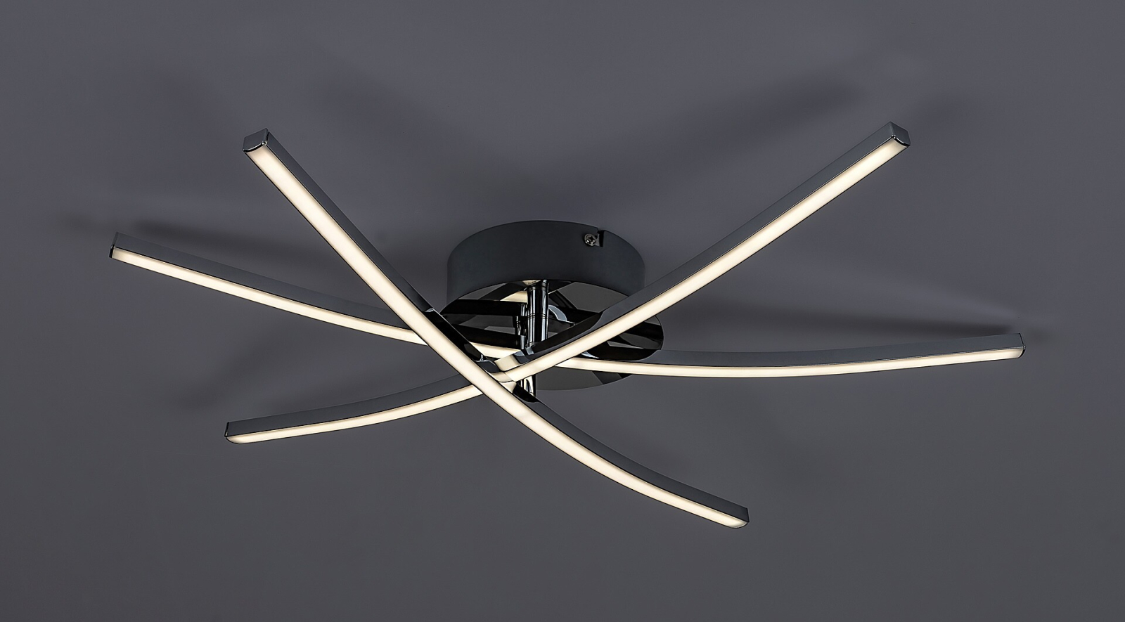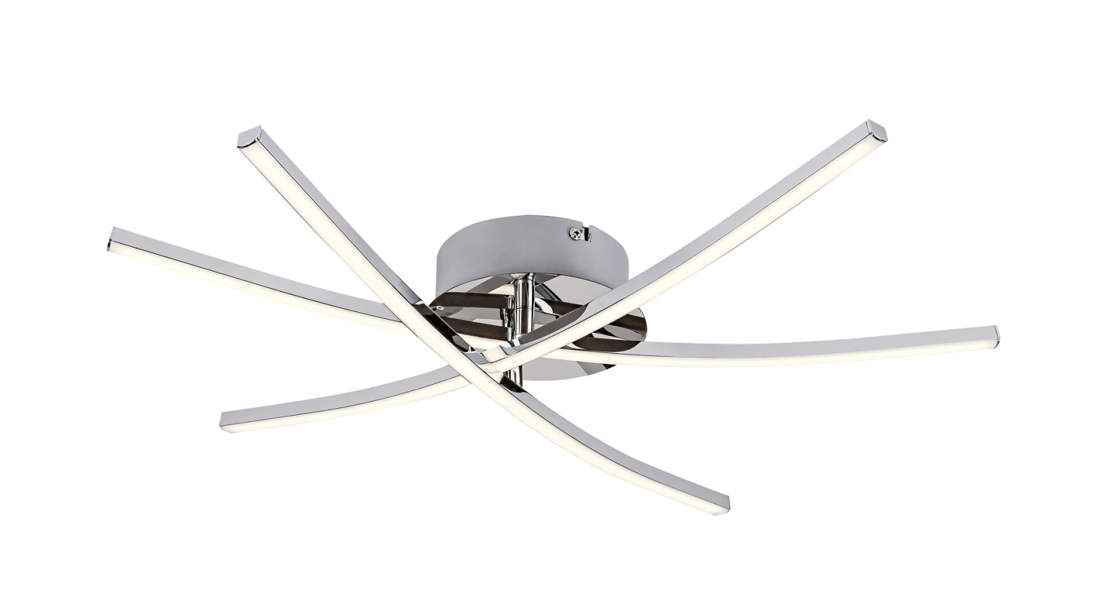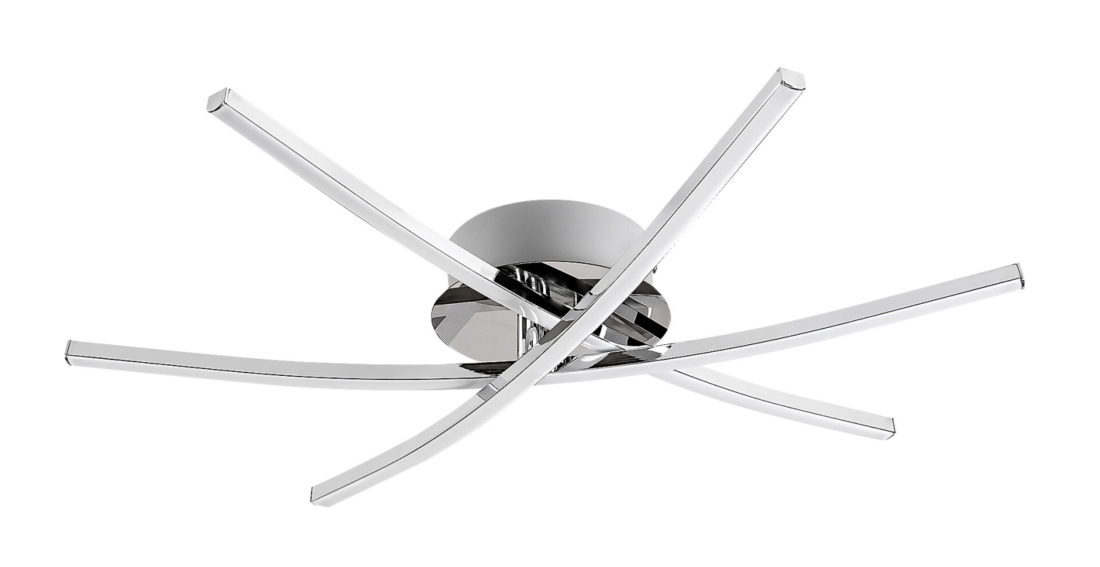Plafoniera Cyclone concepută pentru camerele de zi moderne este recomandată celor cărora le plac suprafețele cromate strălucitoare și ar alege un model mai impresionant și mai deosebit în locul plafonierelor discrete care se îmbină în planul tavanului. Lampa Cyclone din metal în formă de stea este completată de abajururi din plastic alb și poate fi atașată de tavan folosind o bază decorativă mică, rotundă. Trei elemente de lampă lungi, ușor curbate, care se intersectează sunt atașate de baza decorativă, formând o stea strălucitoare cu șase colțuri. Plafoniera are o sursă de lumină LED încorporată aparținând clasei energetice G, cu o putere de 21 W, o luminozitate de 1450 de lumeni cu abajur, 2250 de lumeni fără abajur și cu o durată de viață de 20.000 ore. Lampa are o temperatură de culoare de 4000 K, ceea ce înseamnă că iluminează cu lumină albă naturală, creând un efect modern și curat în camera de zi. Dimensiunile lămpii Cyclone sunt următoarele: diametru 570 mm, distanța față de tavan 90 mm, diametru de instalare 120 mm.