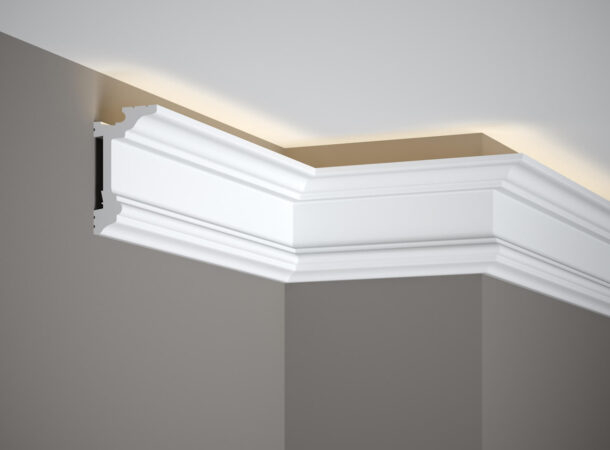 MD137 este o bară luminoasă excepțională. Prezintă detalii frumoase și manoperă de înaltă precizie, așa că va fi perfect chiar și ca singur element decorativ într-un interior minimalist. Banda luminoasa are spatii special modelate pentru a ascunde banda LED, iar tehnologia inovatoare LightGuard® face ca lumina sa fie difuza subtil, fara efectul inestetic al strapungerii LED-urilor. Banda este realizată din polimer PolyForce. Este un material impermeabil care va fi perfect pentru interioare cu niveluri ridicate de umiditate și lumină solară intensă, precum spălătorii și bucătăriile. Un grund special face posibilă vopsirea mulării în orice nuanță imediat după montarea acesteia pe perete. .