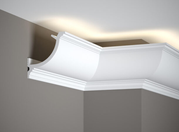 Banda de iluminat QL027 este o bandă decorativă convexă cu frezare delicată, decorativă. Dimensiunea universala a benzii permite utilizarea in incaperi de inaltime standard, fara a obtine efectul de diminuare optic a spatiului. Modelul este dedicat utilizării cu iluminare LED. Tehnologia patentată LightGuard® nu lasă lumina să treacă prin suprafață, astfel încât LED-urile să nu strălucească prin material în pete. Banda de tavan este realizată din material PolyForce rezistent la apă și durabil. Plasticul este, de asemenea, rezistent la UV, astfel încât banda poate fi instalată lângă ferestre în lumina directă a soarelui. Acoperit cu grund, este potrivit pentru vopsirea cu vopsea pe baza de apa. .