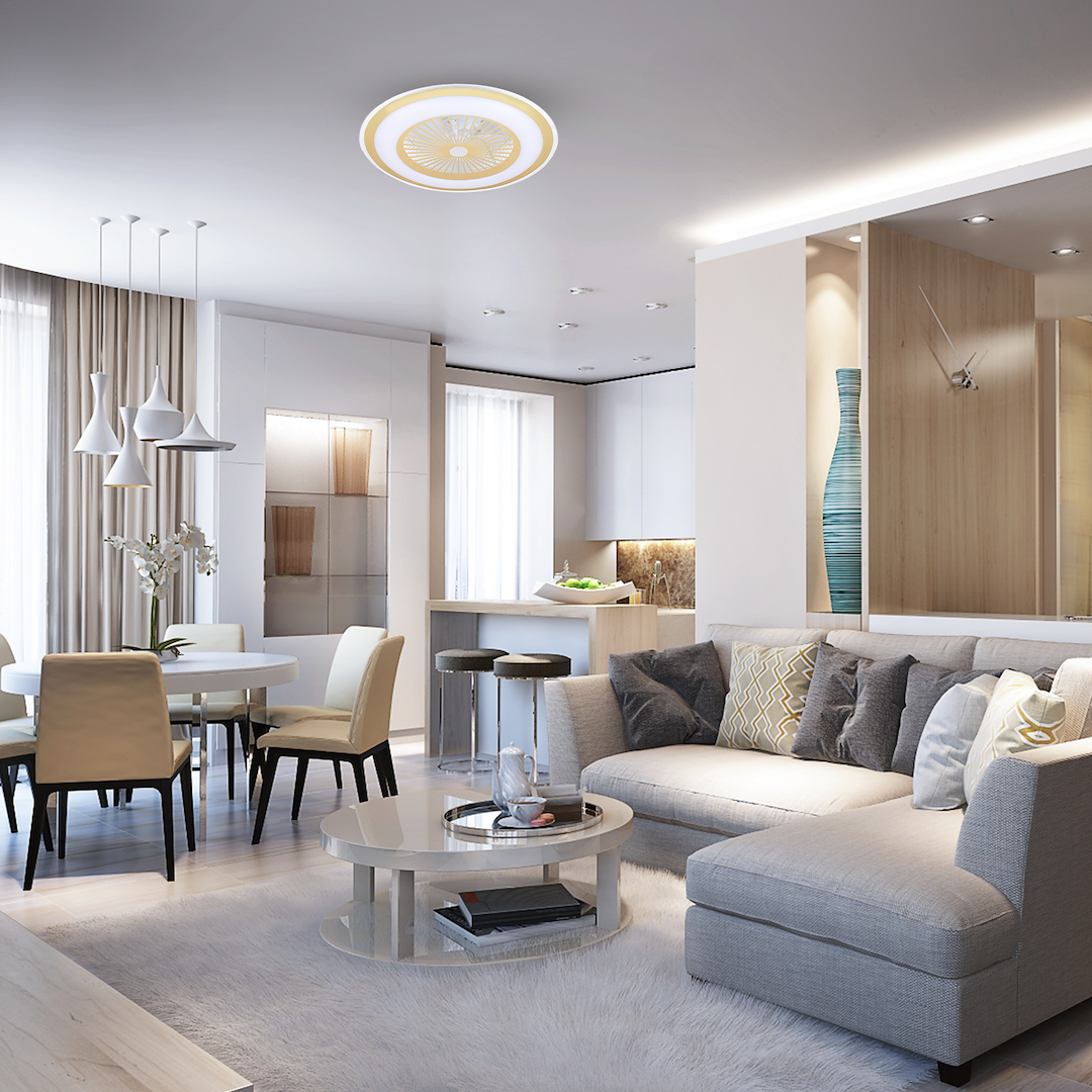 Ventilator Zephyr combina functionalitatea cu designul contemporan. Realizata din Gold Metal & Plastic. Este dotata cu sursa de lumina LED, putere de 48W LED, temperatura de culoare 3000K/6000K, asigurand o iluminare eficienta si placuta. Prezinta gradul de protectie IP20, fiind potrivita pentru utilizare interioara. Functie de reglare a intensitatii luminoase (dimabil triac) pentru control complet al ambiantei. Functioneaza la tensiune de 230V. Dimensiunile sale (diametru de Ø600mm, adancime de 600mm, inaltime de 170mm) o fac perfect adaptata pentru spatii generoase precum holuri, sufragerii, sali de receptie, spatii moderne. O solutie de iluminat eleganta care va transforma atmosfera oricarui spatiu modern.